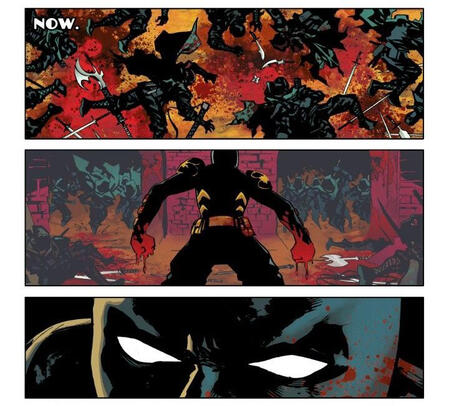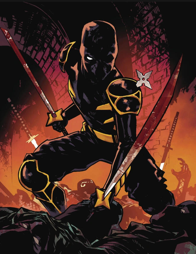 Following the Hand's defeat, there was no longer a need for her mask as a trophy and a warning, and her status as a anti-Hand fighter - so she made a brand new, black and yellow suit that embraced her roots as a ninja while still creating a new image for herself. Like her previous Ronin suit, this one offers considerable protection against sharp weapons, and its black color gives her an effective though unneeded boost when engaging in stealth. It also ups the intimidation factor, a much intended side effect of the design.